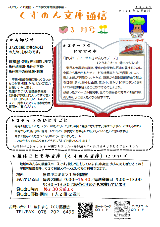 だんだんと暖かくなってきましたね😊お散歩ついでにくすのん文庫に遊びにきませんか? ★体操服・制服回収のお知らせ卒業・進級のシーズンです。着なくなった体操服・制服がありましたらぜひ魚住まちづくり協議会事務所までお持ちくださ […]