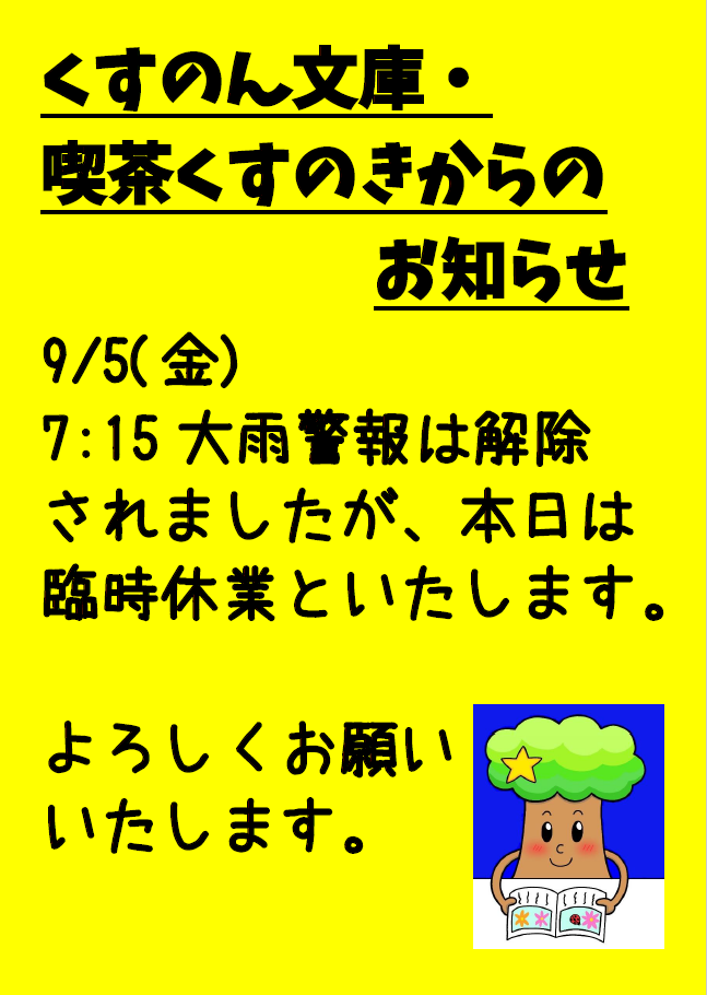 9/5(金) 喫茶くすのき・くすのん文庫臨時休業のお知らせ