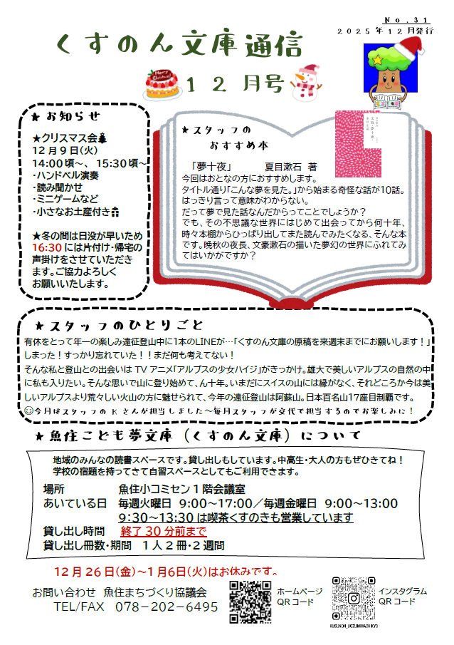 いよいよ今年も終わりに近づきました。寒い日も、あったかいくすのん文庫で本を読んだり宿題をしたりしませんか❓