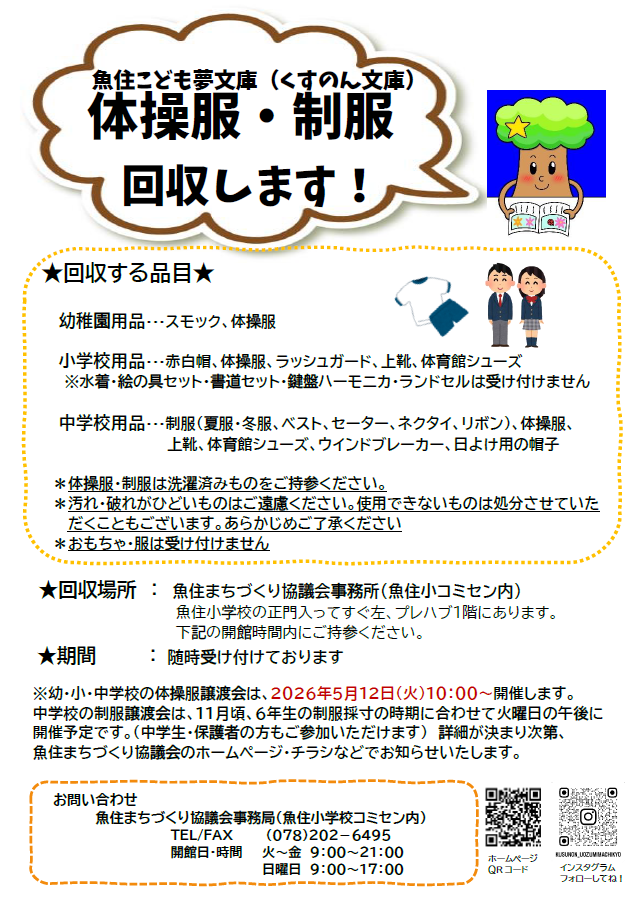 卒業・進級のシーズンです。着なくなった体操服・制服がありましたらぜひ魚住まちづくり協議会事務所までお持ちください。